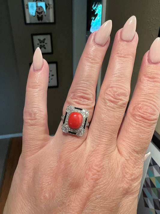 Art Deco coral, onyx and diamond ring