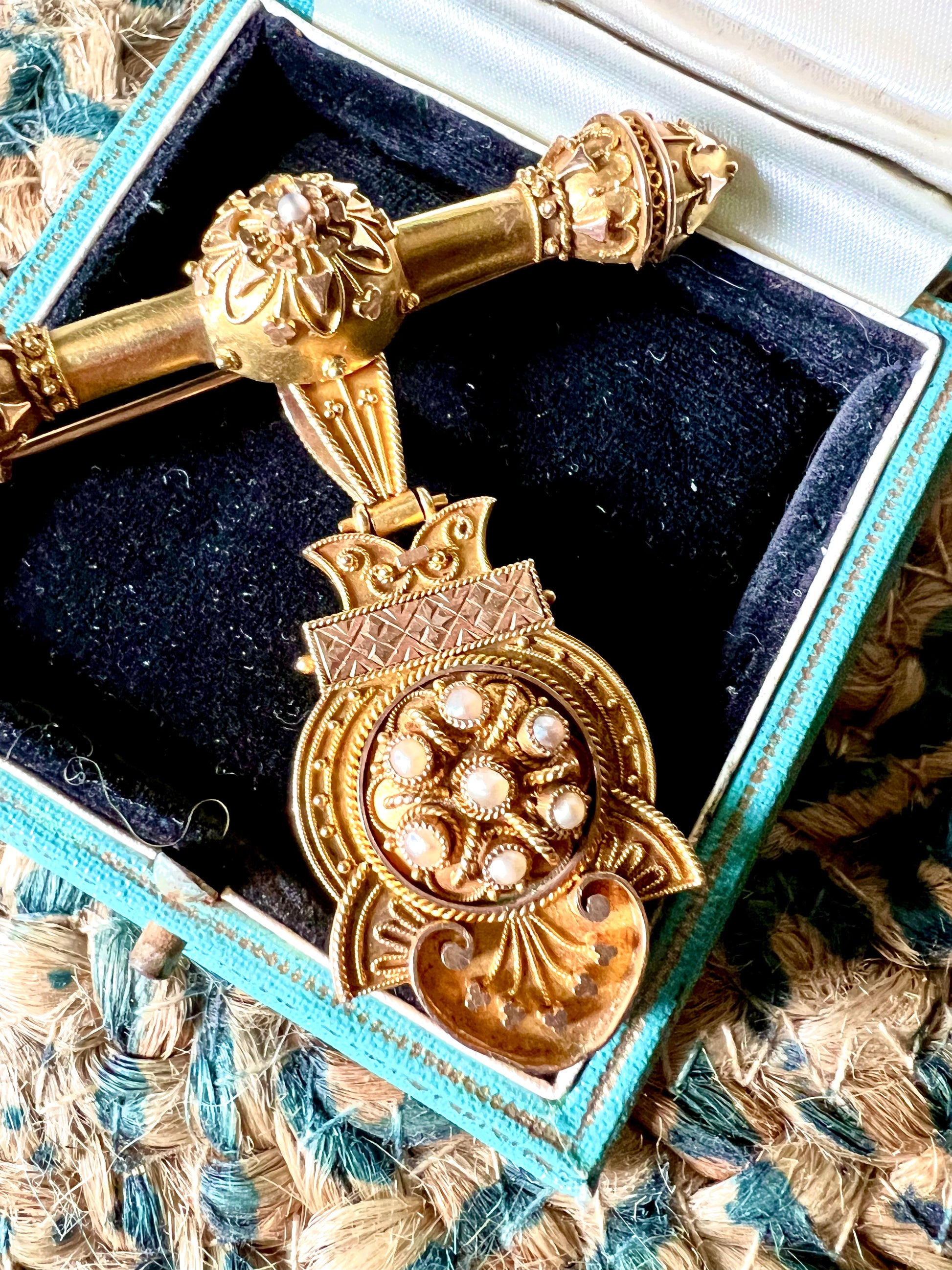Etruscan revival locket pendant with matching bar pin brooch. Set is 15k rose and yellow gold the main pendant portion opens up to a glass compartment for a photo or keepsake. It can also be hung on the matching bar pin brooch and worn on your lapel. This wonderful piece was made between 1860-1880 and is in amazing shape for its age.